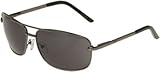 Kenneth Cole Reaction slim aviator sunglasses have a gunmetal tone wire frame and smoke colored lenses; a bar lies above the bridge. These stylish sunglasses have wide tortoise ear rests with a logo-stamp along the interior. Cushioned nose pads give the bridge added comfort.